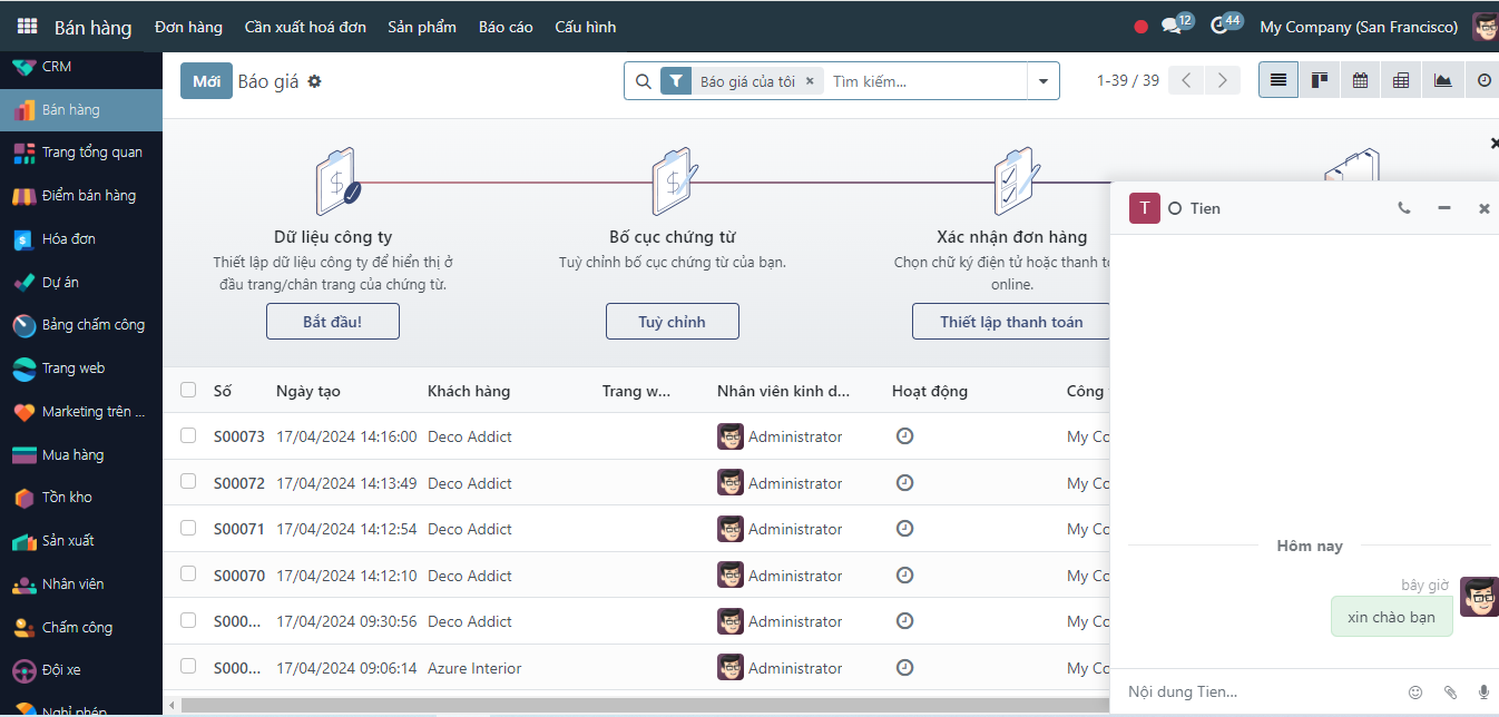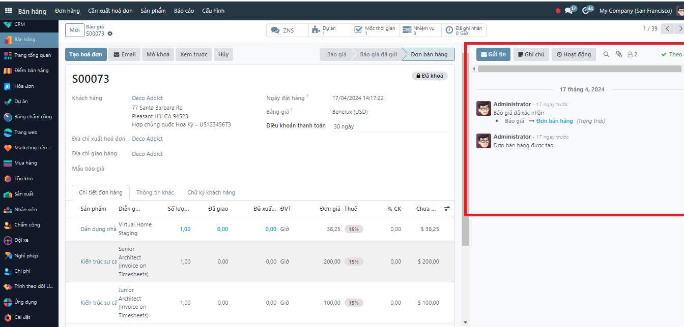 Tổ chức các kế hoạch hoạt động tại Odoo Các hoạt động tại thanh chatter sẽ được hệ thống ghi nhận thông báo vào trong Thảo luận gồm: tag tên một người dùng nào đó tại mục Ghi chú, gửi một nội dung bất kỳ trong mục Gửi tin. Ngoài ra, bạn cũng có thể lên kế hoạch cho các hoạt động mình cần phải làm, hoặc giao việc cho người khác tại mục hoạt động.