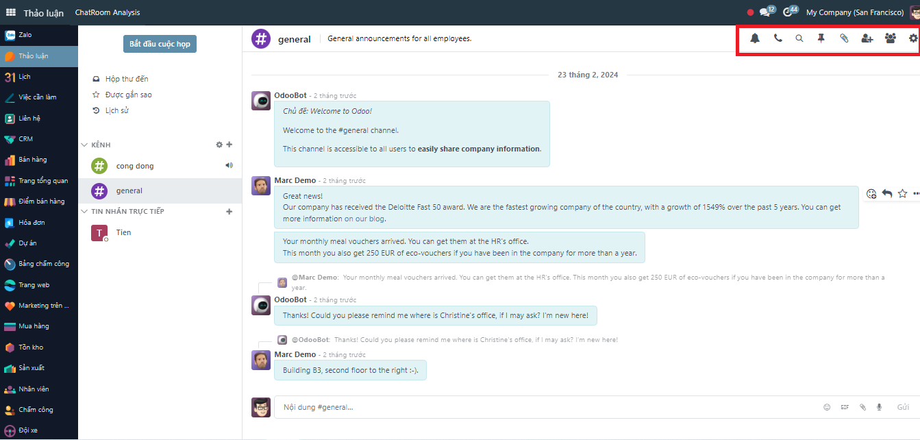 Các thẻ chat nhanh @, #, / Nhằm giúp người dùng thuận tiện hơn trong quá trình sử dụng phần mềm, hệ thống đã thiết lập sẵn các thẻ chat nhanh gồm: - Ký tự @ : tại ô chat, khi bạn gõ ký tự "@" hệ thống sẽ mở ra tab gợi ý gồm tên các người dùng trong Kênh chat đó. Thẻ chat @ sẽ giúp bạn tag tên người dùng đó để họ nhận được thông báo về thông điệp bạn gửi. - Ký tự # : tương tự như thẻ chat @, thẻ chat # sẽ giúp bạn tag một kênh để mọi thành viên trong Kênh đều nhận được thông báo về thông điệp bạn gửi. - Ký tự / : tại ô chat, khi bạn gõ ký tự "/" hệ thống sẽ mở ra tab gợi ý gồm: help, lead, leave, ticket, who tương ứng với các tính năng như dưới đây. Trong đó "/lead" sẽ giúp bạn tạo nhanh một cơ hội trong ứng dụng CRM, và "/ticket" sẽ giúp bạn tạo một yêu cầu hỗ trợ trong ứng dụng Helpdesk từ ngay giao diện chat.